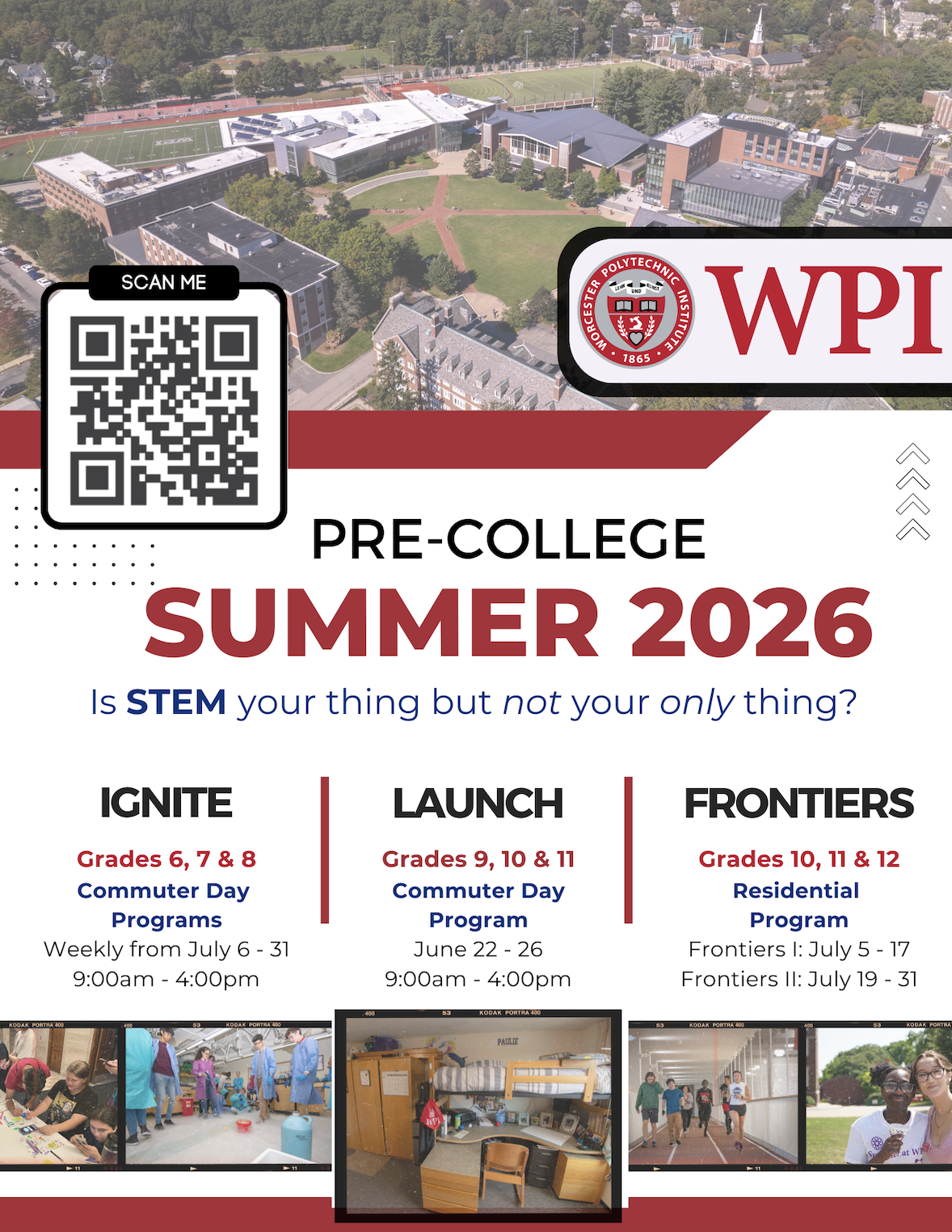 Frontiers - Grades 10 – 12, A non-credit, two-week residential program. Students will learn alongside peers from around the globe, sample a STEM or business major and humanities, arts, or business minor, engage in a college readiness program, and explore what WPI’s campus has to offer outside of the classroom.